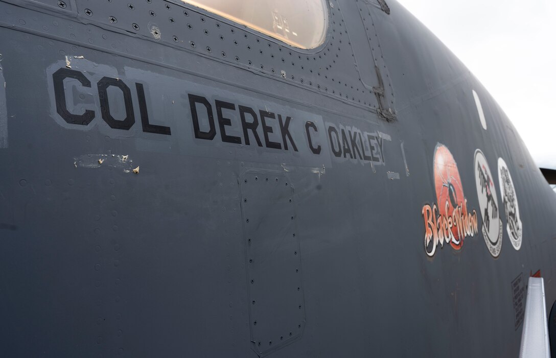 A U.S. Air Force B-1B Lancer, assigned to the 28th Bomb Wing, shows the name of the incoming 28th BW commander at Ellsworth Air Force Base, South Dakota, June 23, 2023. The B-1B is utilized globally as a multi-purpose bomber. (U.S. Air Force Photo by Airman 1st Class Yendi Borjas)