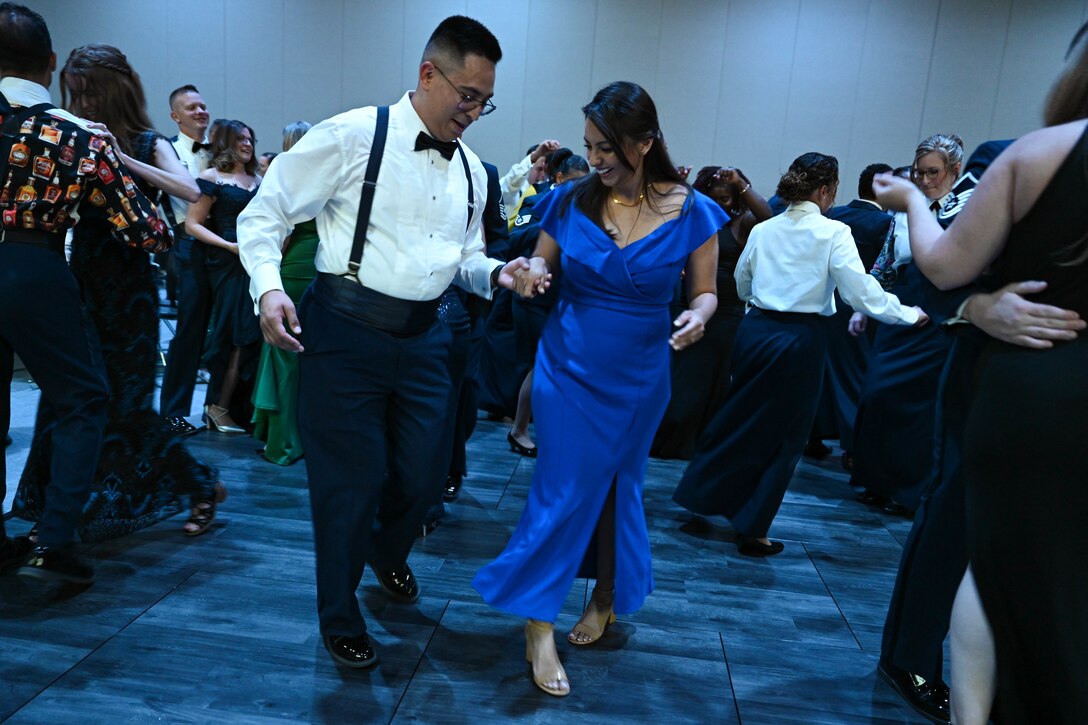 Master Sgt. Sergio Escobedo, 372nd Training Squadron B-1 field training section chief, dances with his spouse at the Ellsworth Air Force Ball, Sept. 16, 2023, in Box Elder, South Dakota. The Air Force Ball is a social function for military members, their spouses and family to celebrate the U.S. Air Force birthday. (U.S. Air Force Photo by Airman 1st Class Dylan Maher)