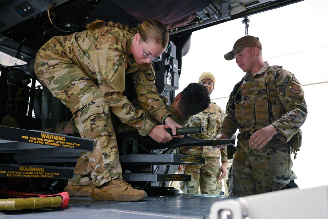 U.S. Army National Guard Sgt. Lydia Raderschadt, left, 189th Charlie Company critical care flight paramedic, demonstrates how to position a stretcher inside of a HH-60M Black Hawk, Oct. 11, 2023, at Rapid City Army National Guard Base. Ellsworth Air Force Base Security Forces members were trained on how to safely transfer the stretcher upon entering and exiting the helicopter cabin. (U.S. Air Force photo by Airman 1st Class Dylan Maher)