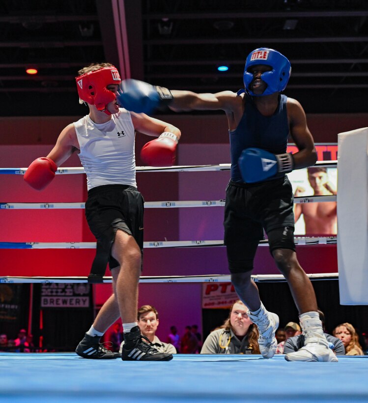 Airman Henry Echebu, right, 28th Logistics Readiness Squadron material management specialist, throws a punch at his opponent, Sam Strobel, Rapid City Law Enforcement Officer, during the Battle of the Badges at Box Elder, South Dakota, Jan. 13, 2024. Battle of the Badges is a non-profit amateur boxing exhibition with the goal of raising awareness and support for local emergency medical services, law enforcement, correction officers and military members. (U.S. Air Force photo by Airman 1st Class Dylan Maher)