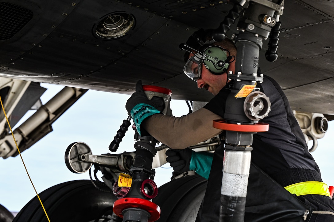 U.S. Air Force Staff Sgt. Jacob Szatkowski, 37th Bomber Generation Squadron dedicated crew chief, attaches a fuel line to a B-1B Lancer during a hot-pit refuel at Grand Forks Air Force Base, N.D., Oct. 1, 2024. The success of the hot-pit refuel commemorated the last B-1 to leave Grand Forks AFB 30 years ago in 1994. (U.S. Air Force photo by Senior Yendi Borjas)