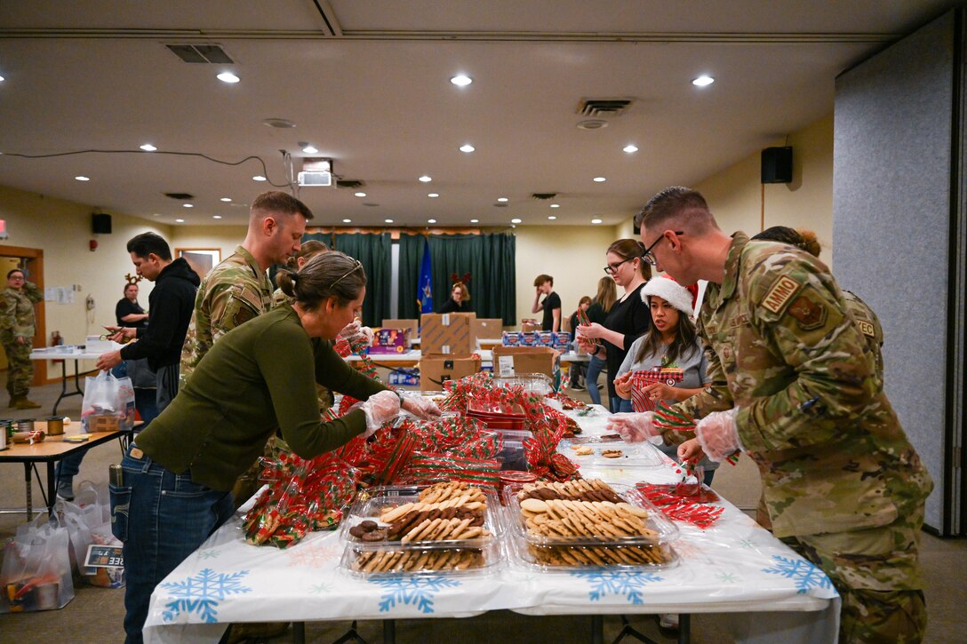 Members of Ellsworth Air Force Base wrap up cookies to put into a gift bag at Ellsworth Air Force Base, Dec. 4, 2024. Volunteers from Ellsworth and the Box Elder community made gift bags for airmen living in the dormitories on base. (U.S. Air Force photo by Airman 1st Class Alec Carlberg)
